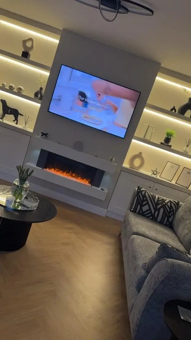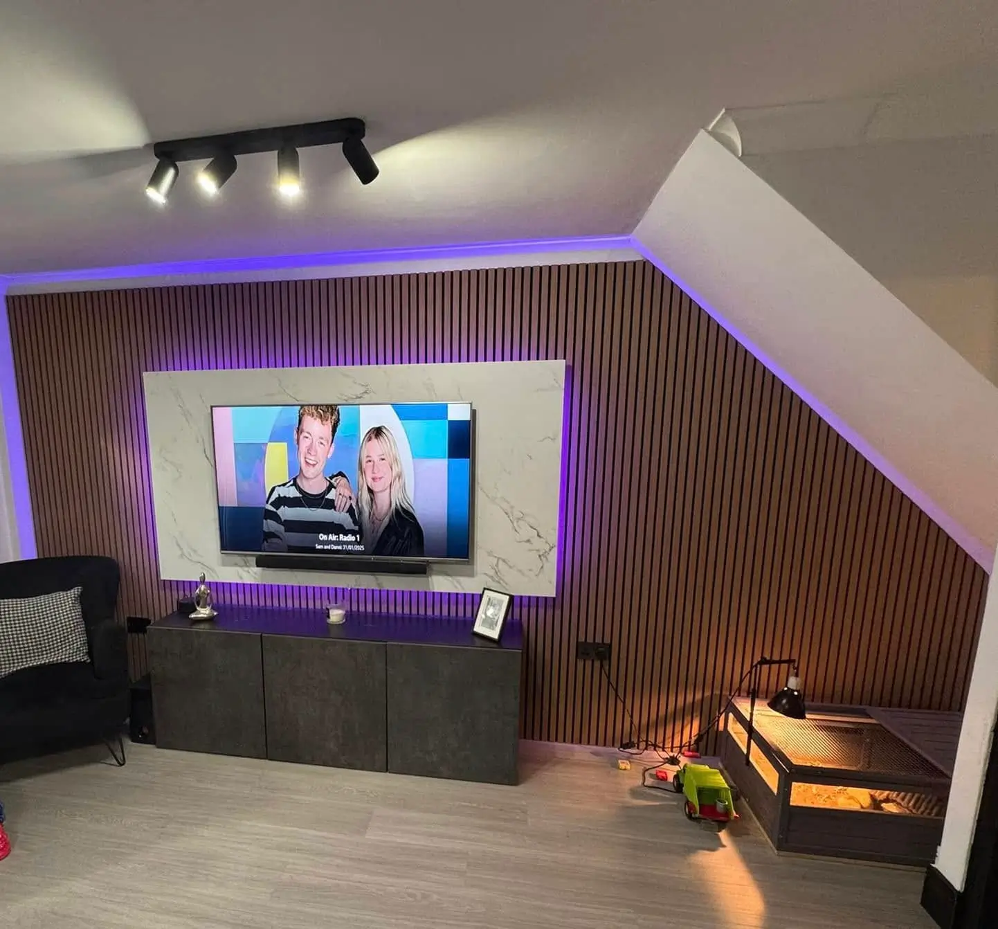 Bespoke media walls with natural oak slats, marble-look panels and RGB LED lighting. Custom TV units, boiler cupboards and sleek wiring for a clean, modern finish.